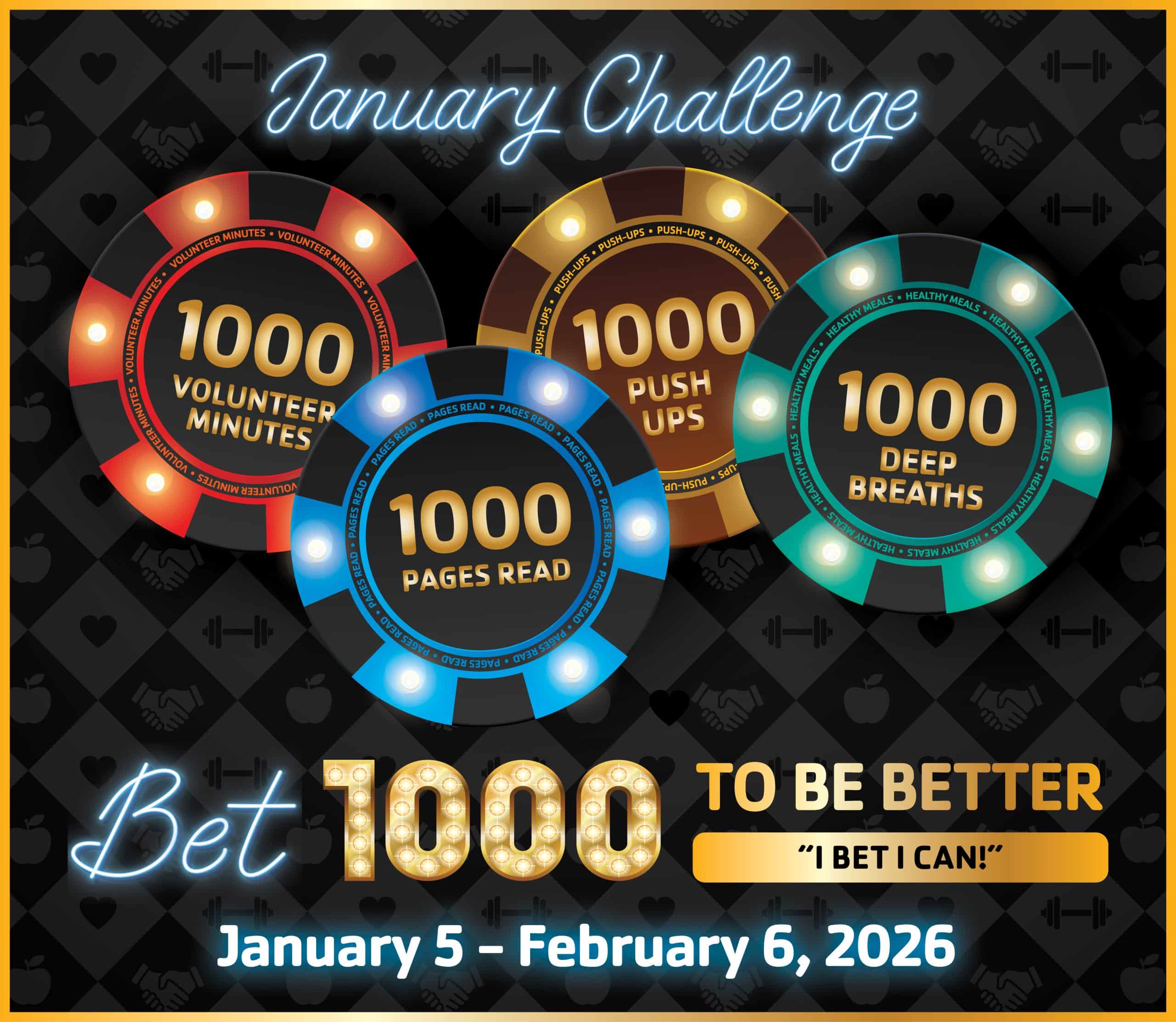 Kick off the new year with a challenge that’s all about YOU – Your goals, your grit, and your impact. Pick something that betters yourself or the community… and bet you can do 1,000 of it.